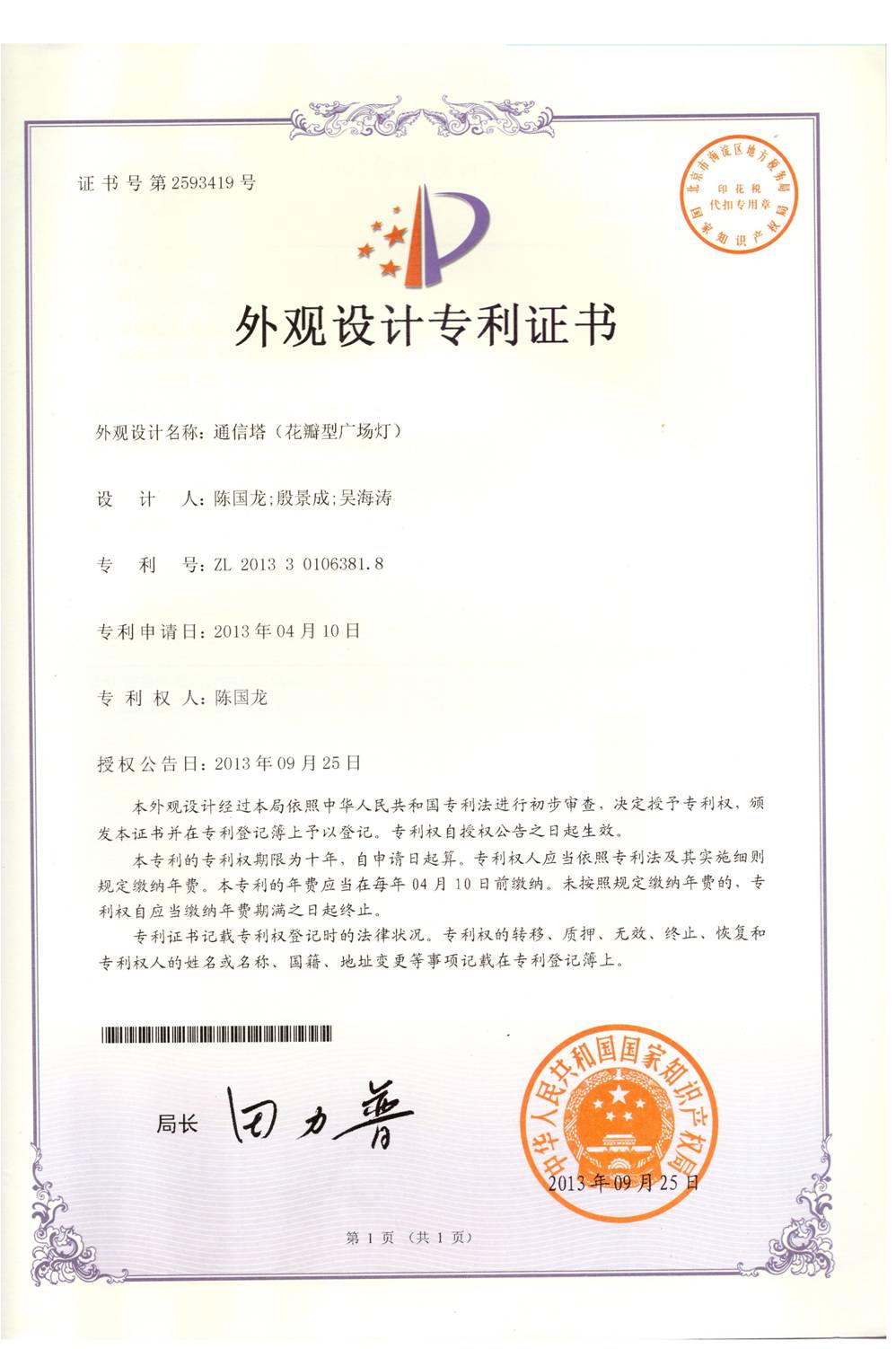 公司获得外观设计《通信塔(花瓣型广场灯)》专利